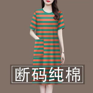 2025夏季女装新款中年妈妈胖mm裙子夏装宽松大码显瘦棉条纹连衣裙