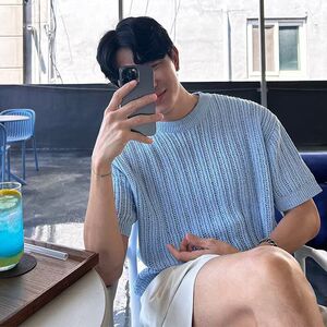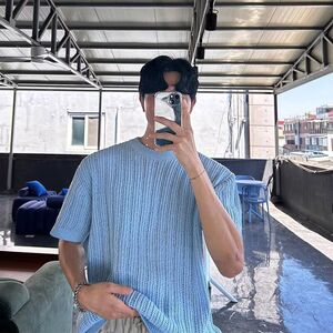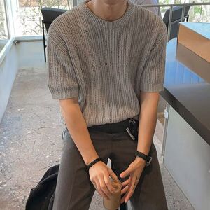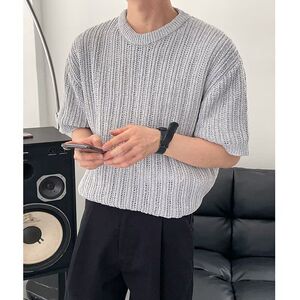 针织短袖男士浅灰色T恤休闲港式潮流INS风上衣夏季透气编织体恤