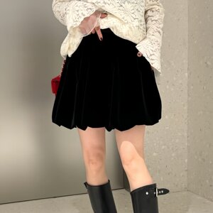 高腰丝绒花苞百褶半身裙女2026春季大码胖MM黑色显瘦A字气质短裙