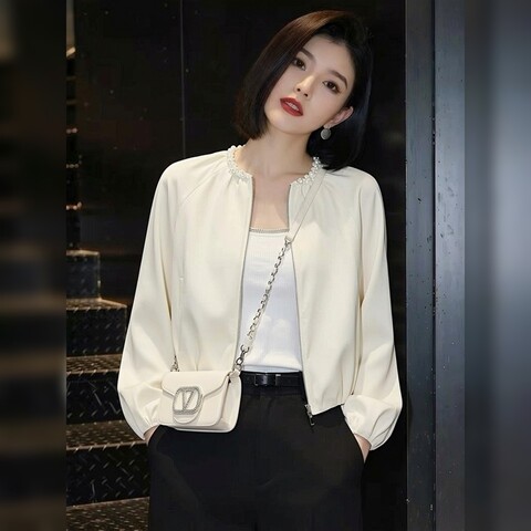 67¥ HU071 hWGu5adZpgb¥ https://m.tb.cn/h.i6e8QCa 富家千金风轻奢米白色钉珠圆领拉链外套女装春季新款别致舒适上衣