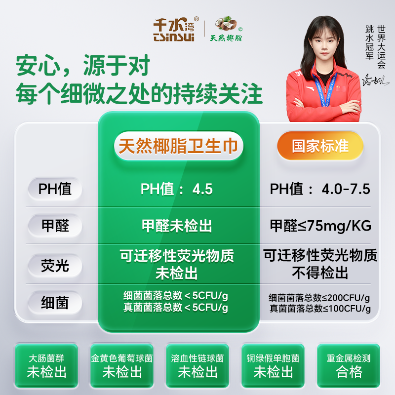 千水湾天然椰脂精华+纯棉表层,0荧光剂0香精,经期敏感肌也能安心使用~学生党友好价,薄至0.8cm却吸量翻倍,整日干爽不侧漏!
