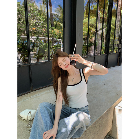 百搭撞色背心方领休闲百搭肌理感针织吊带女夏