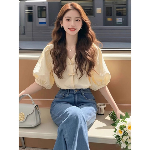 Amiga杏色短袖衬衫女夏季轻奢高级感温柔气质法式泡泡袖盘扣上衣 【售价】:¥25 👉复制这条信息打开【手机淘宝APP】即可领券购买:/