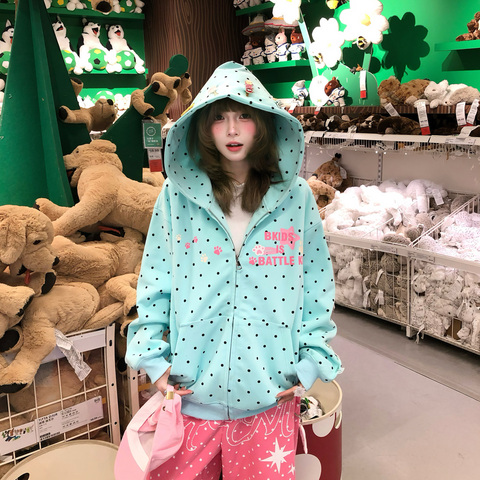 文文不乖原创美式可拆卸发夹波点连帽卫衣女拉链开衫宽松休闲外套