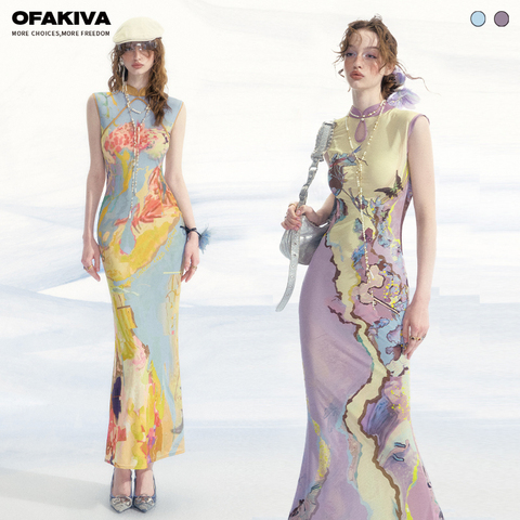【李梦同款】OfAkiva“罗曼词”新中式印花旗袍连衣裙女背心长裙