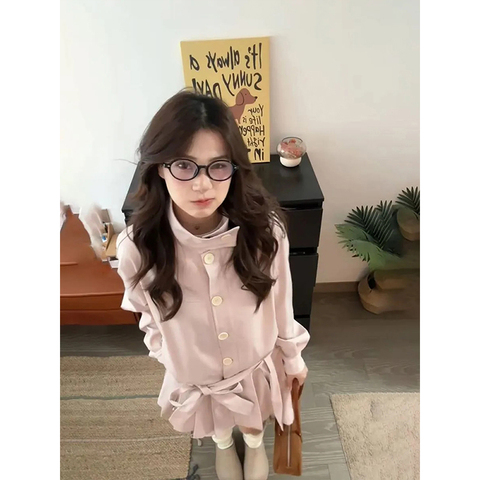 韩式少女感粉色立领中长款风衣女