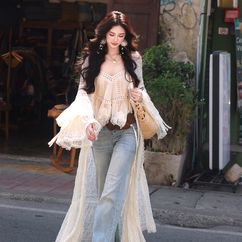 58¥ HU591 FhqTUAAj2ao¥ https://m.tb.cn/h.iT9tEfu AZure法式复古蕾丝绑带开衫荷叶袖花边拼接防晒不规则网纱吊带夏