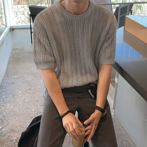 2026夏季新款港风镂空针织短袖t恤男韩系潮流设计感小众宽松半袖