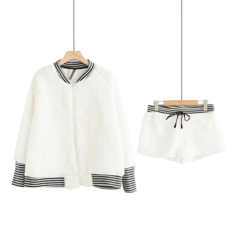 新款加绒加厚羊羔毛条纹两件套