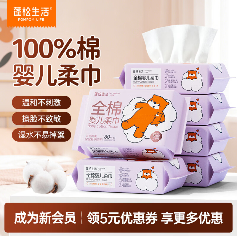 蓬松生活婴儿专用全棉柔巾宝宝一次性成人洗脸巾100%纯棉干湿两用擦脸巾 【全棉柔巾】80抽*5包