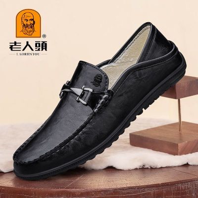 老人头正品男鞋新款冬季加绒豆豆真皮透气软底软皮休闲皮鞋爸爸鞋