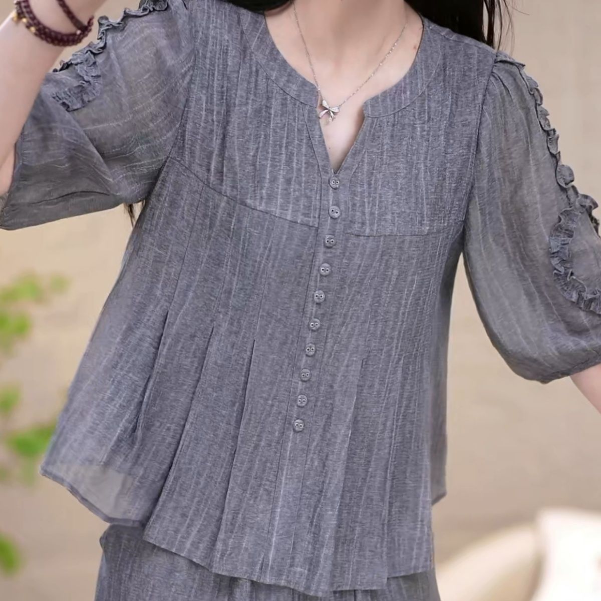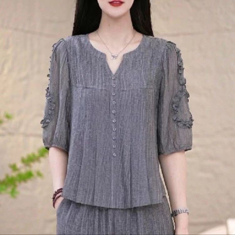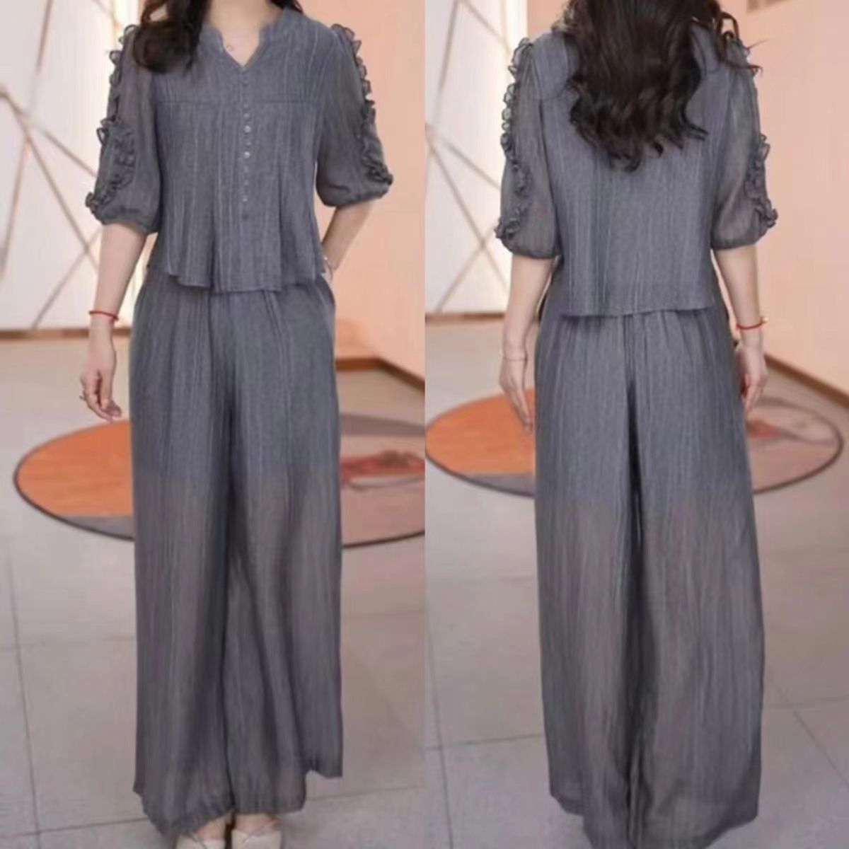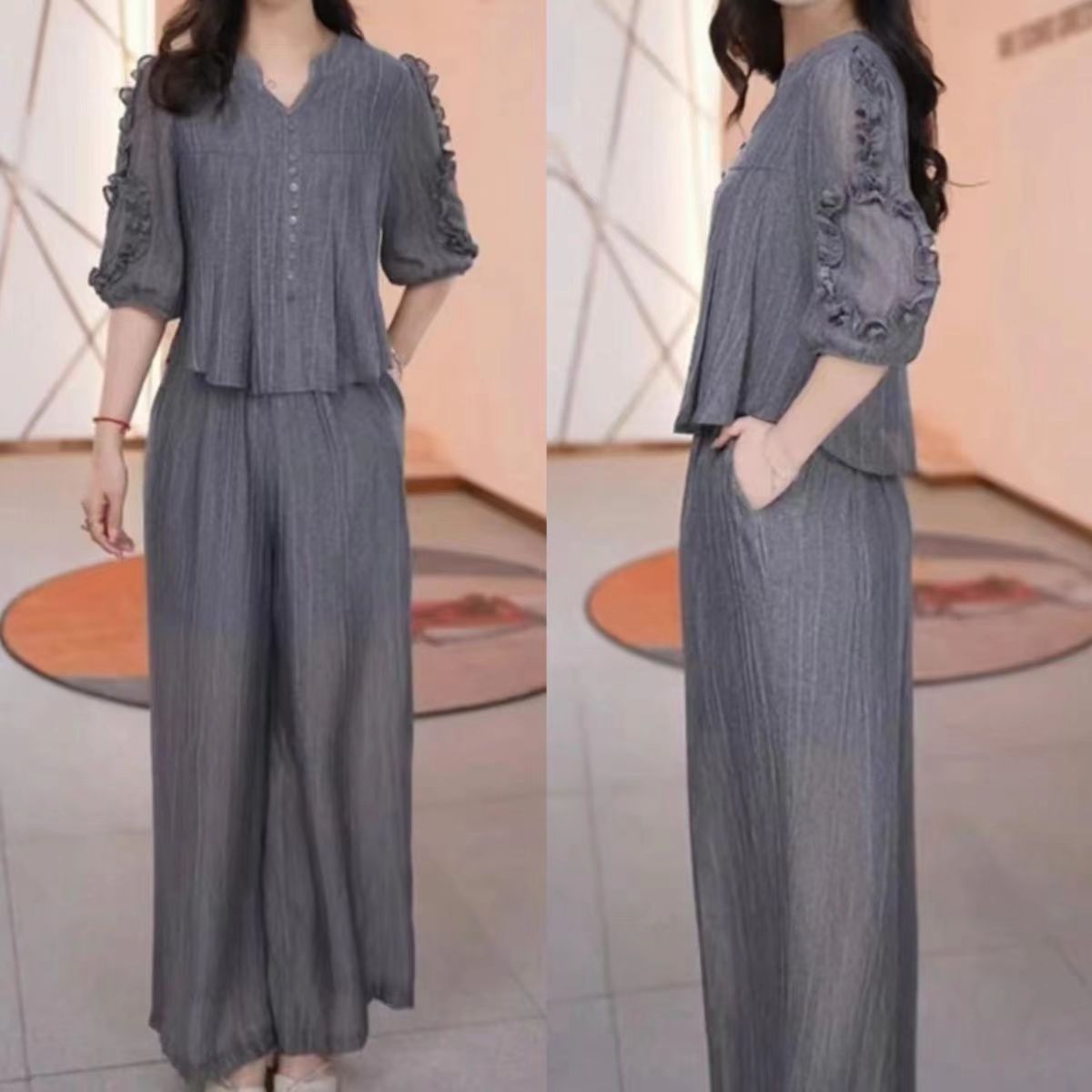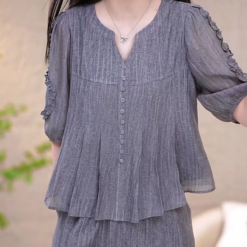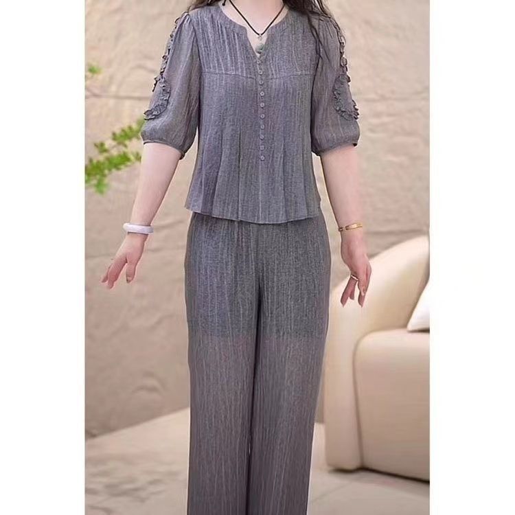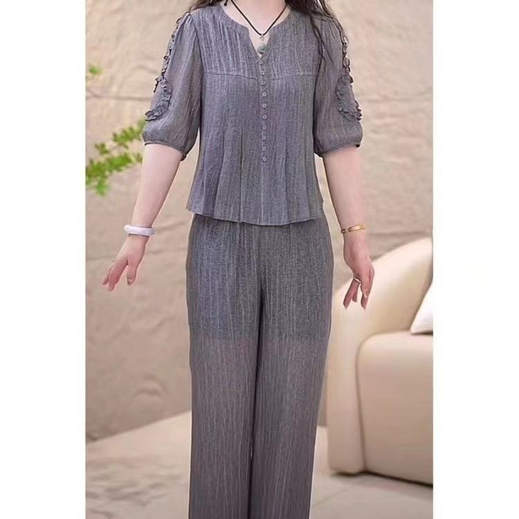 高档时尚洋气套装女夏季新款收腰显瘦减龄妈妈装纯色套装两件套
