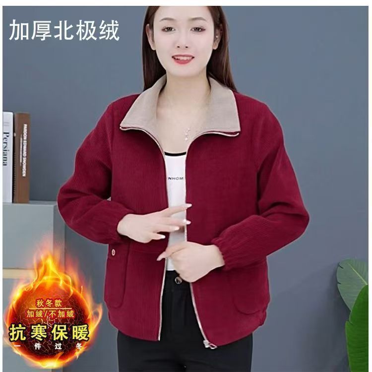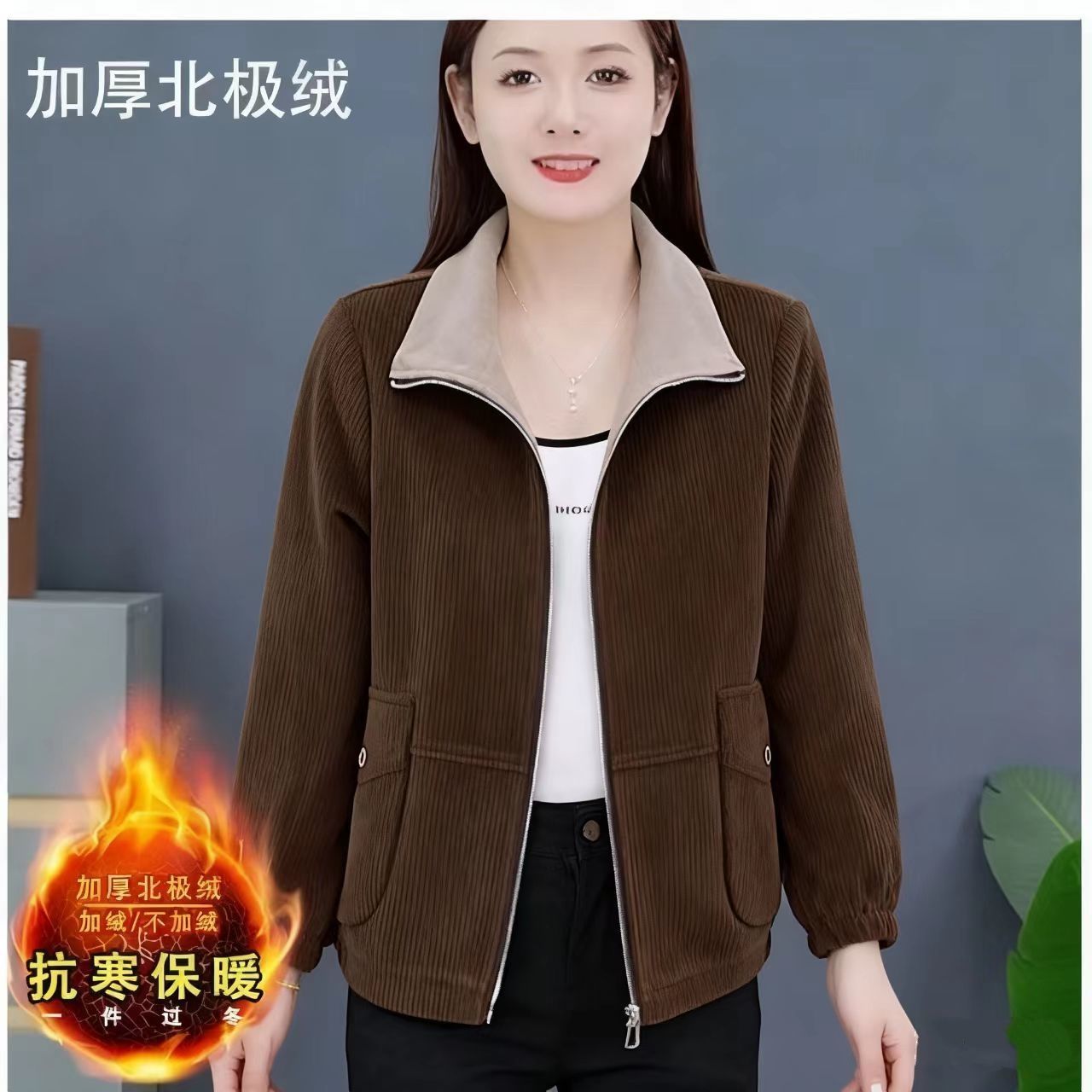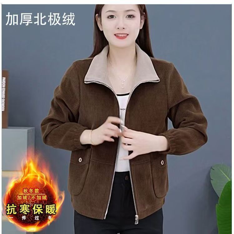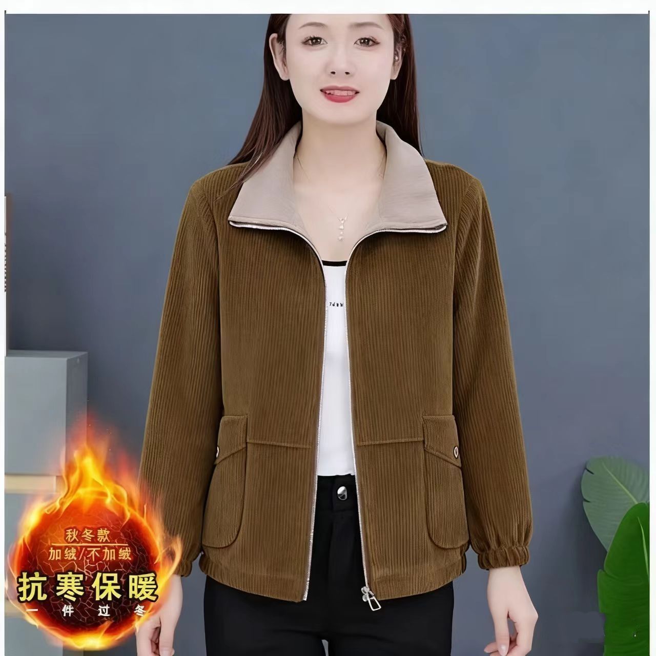 秋冬新款灯芯绒加绒加厚外套妈妈洋气上衣中年时尚翻领小个子上衣