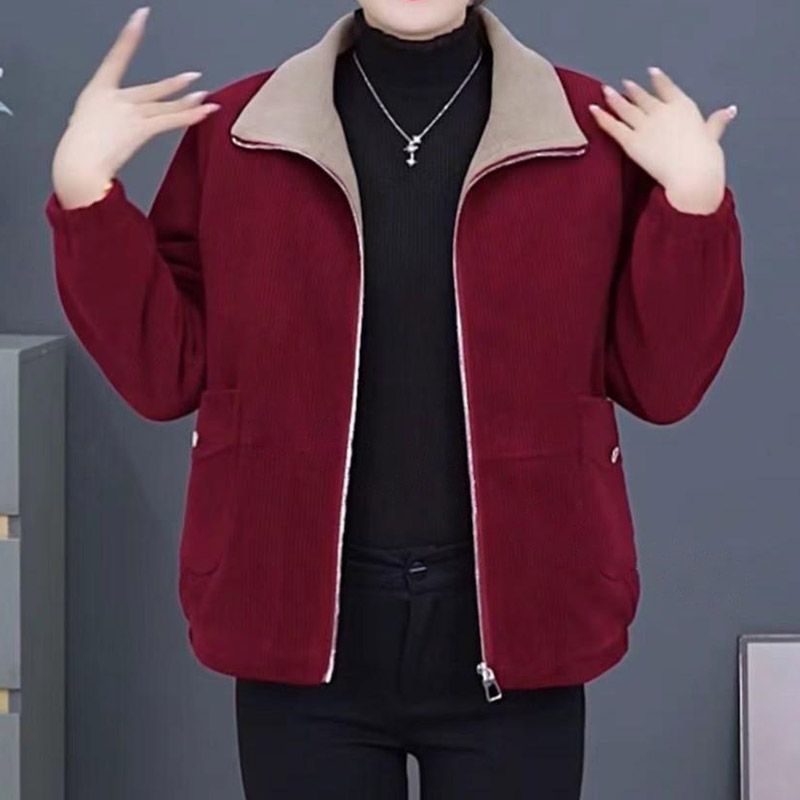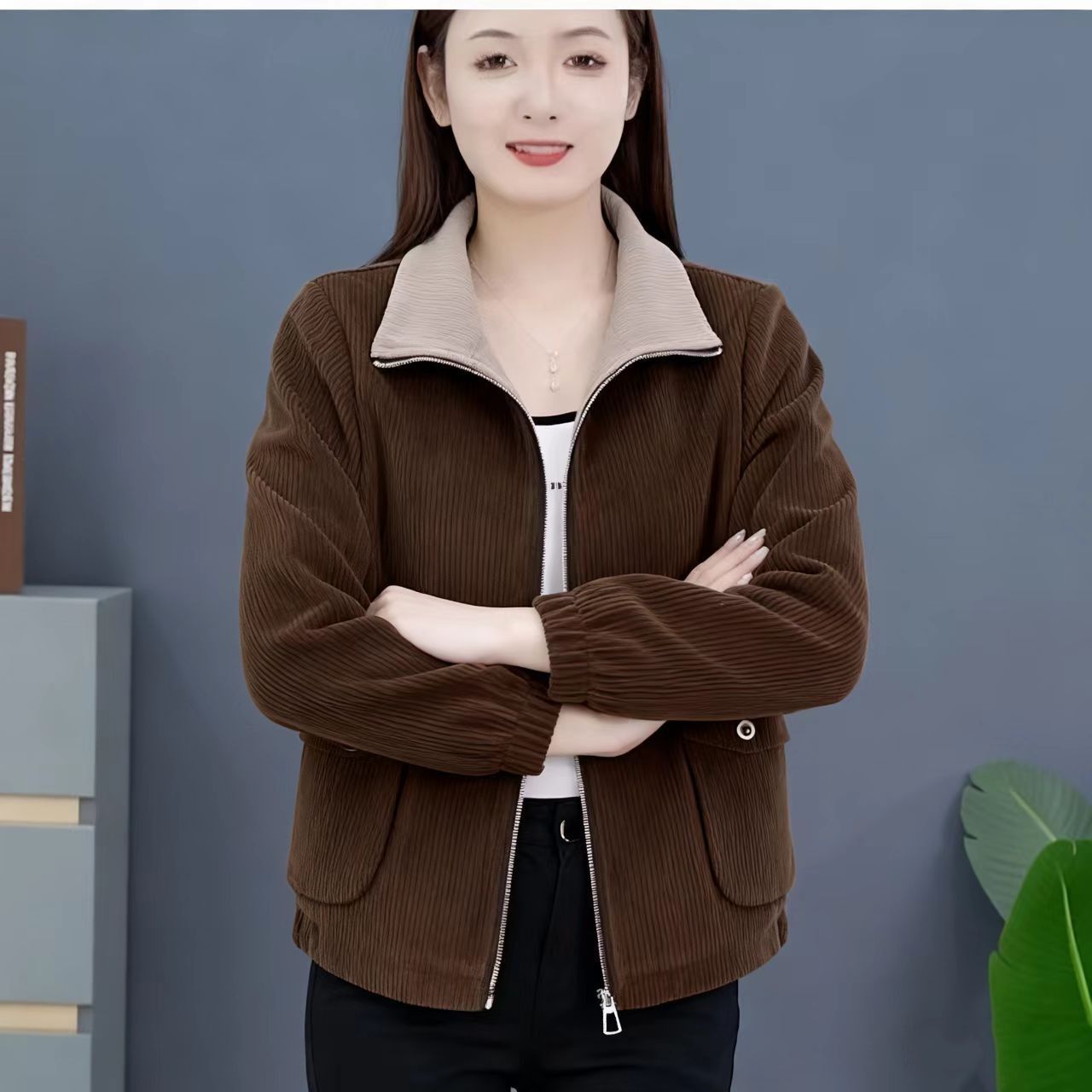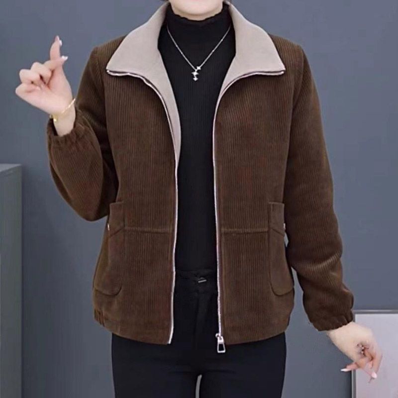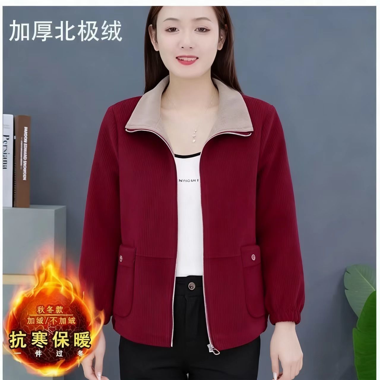 秋冬新款灯芯绒加绒加厚外套妈妈洋气上衣中年时尚翻领小个子上衣