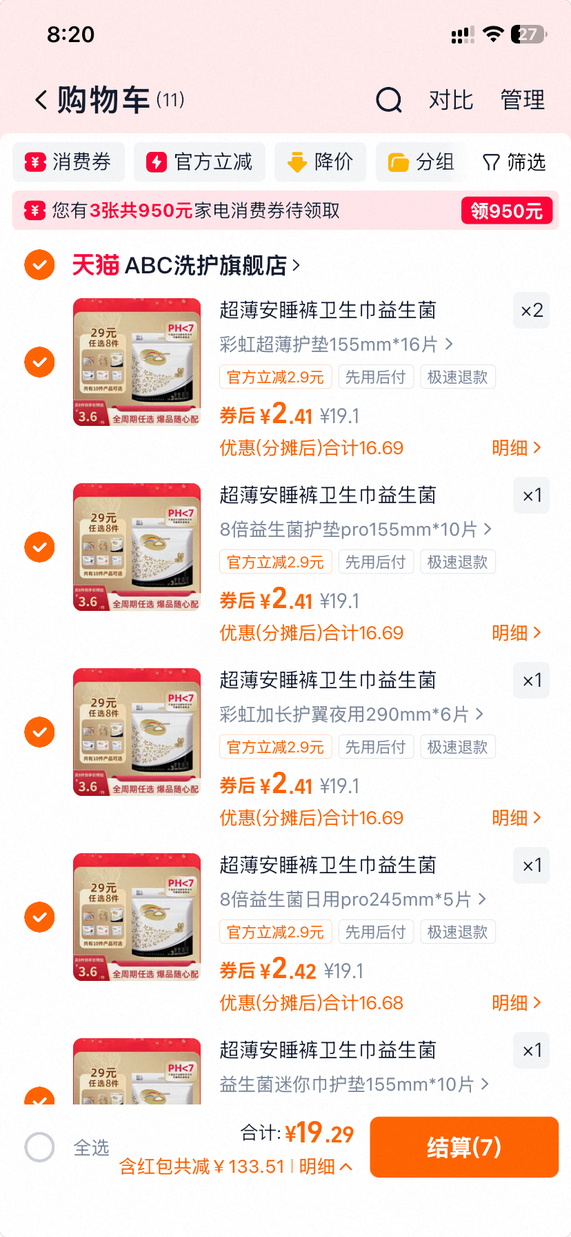 ABC气垫卫生巾任选8件,最低19.29到手!折单2.4