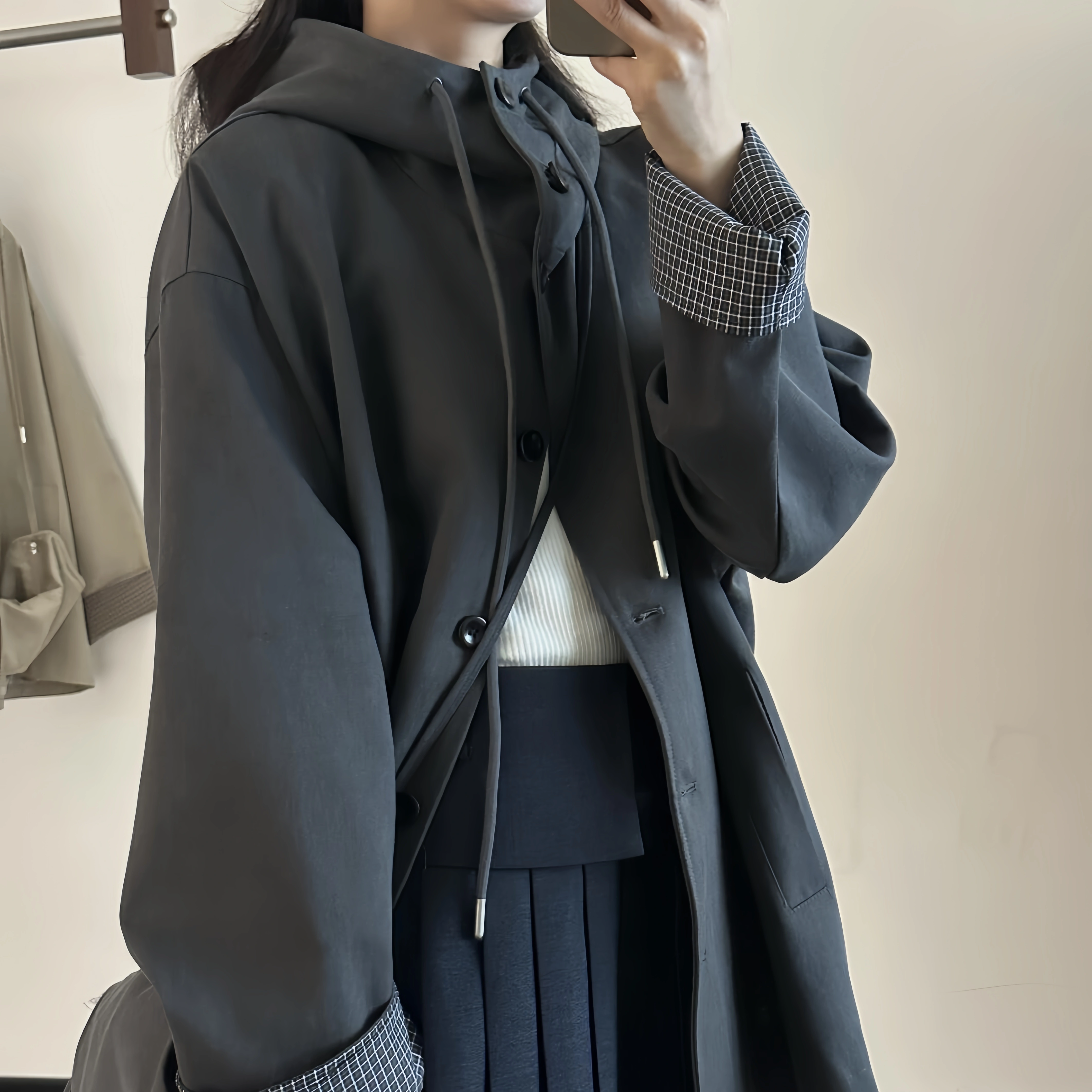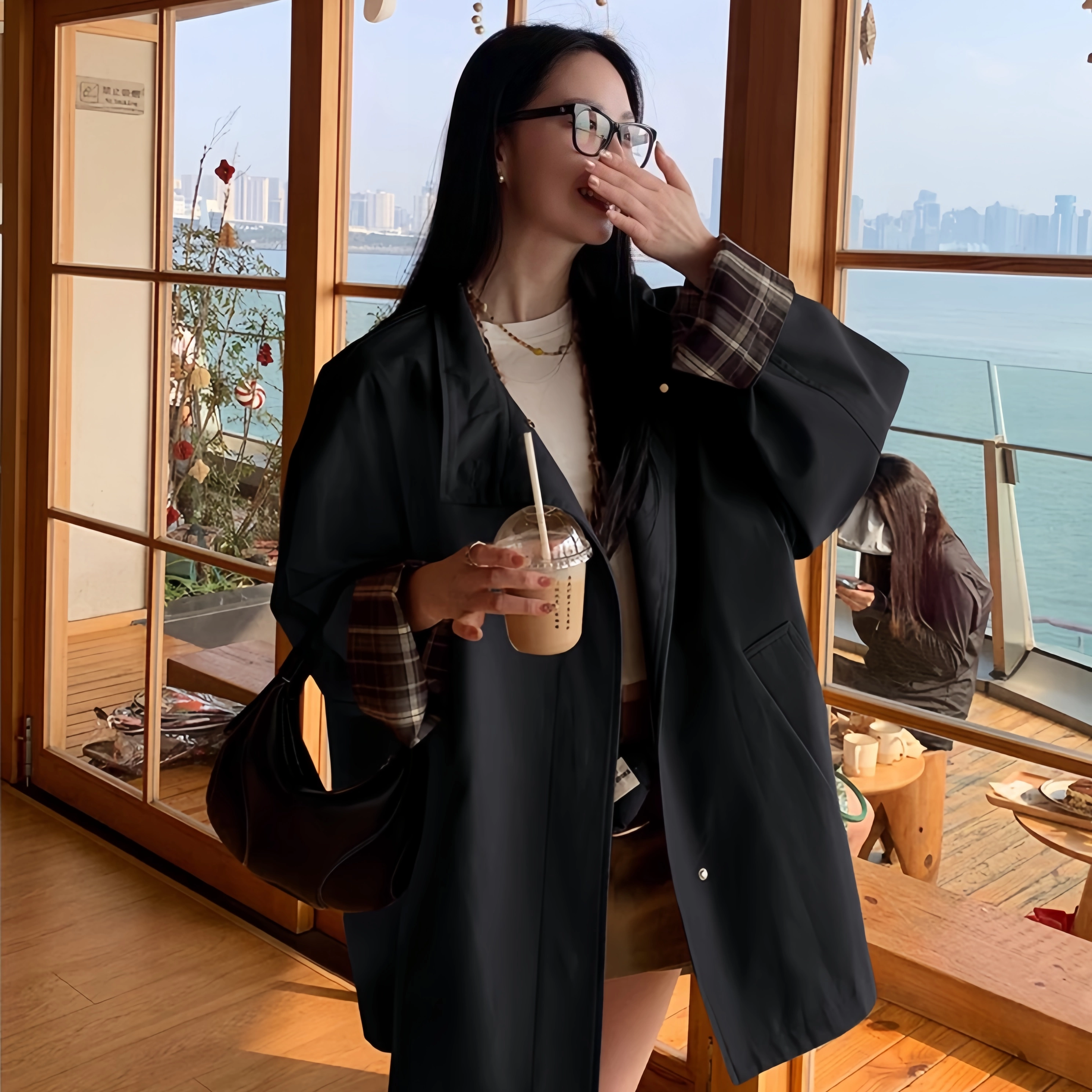 2025春秋小个子中长款外套,百搭韩版时尚短款格子拼接风衣