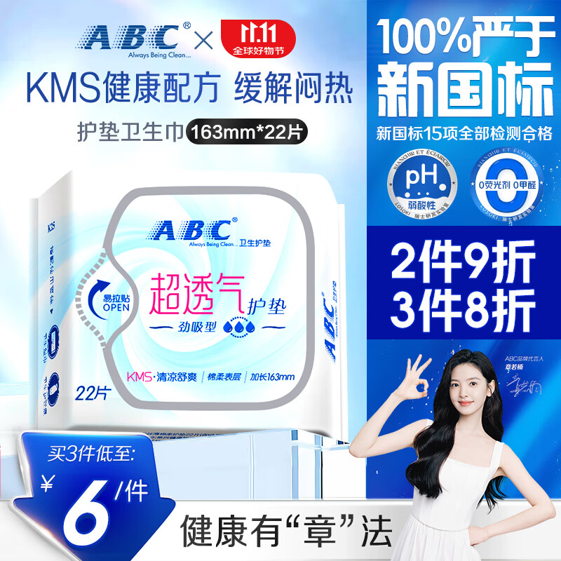 ABCKMS纤薄健康配方超薄透气护垫卫生巾京东自营163mm*22片