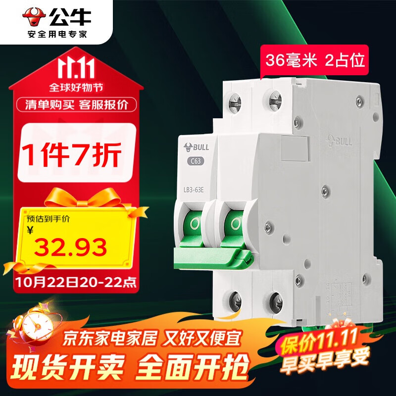 公牛(BULL)空气开关 2P小型断路器 2P双极双进双出32A 空开 LB3-63E/32A-2P