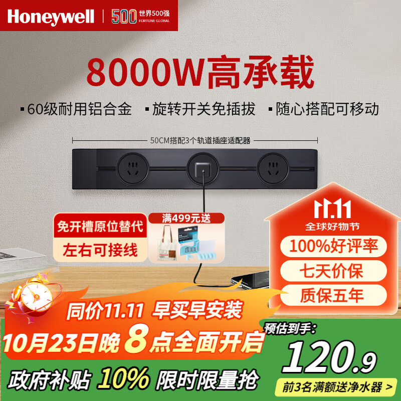 霍尼韦尔(Honeywell)A8轨道插座明装 可移动墙壁插座免打孔壁挂式 滑动轨道排插黑50cm