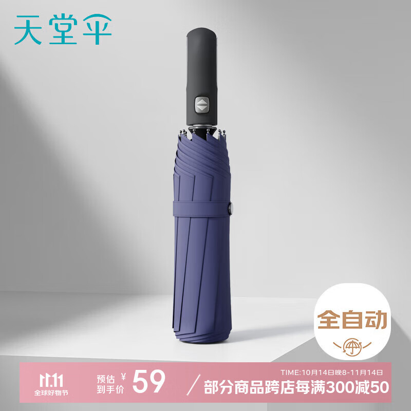 天堂 全自动雨伞三折 10骨加固一键开收易甩干简约晴雨伞 藏青