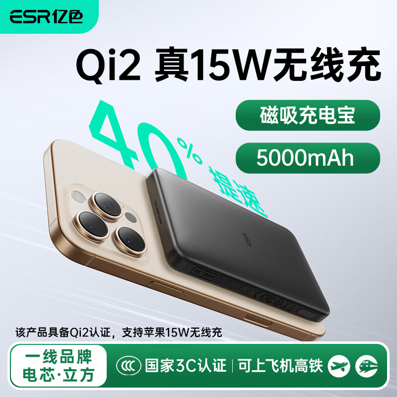 亿色【苹果15W丨3C认证】Qi2磁吸充电宝MagSafe15W无线快充10000/5000毫安可上飞机移动电源适用苹果17 魔力黑丨5千毫安【3C认证】 Qi2认证丨真15W无线快充