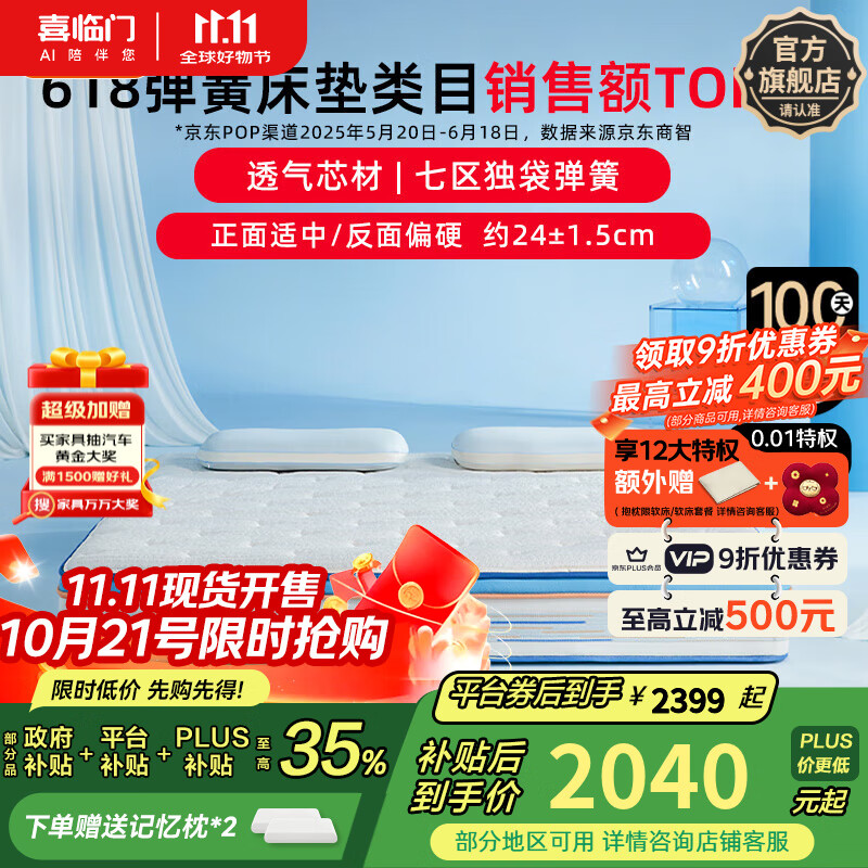 喜临门床垫 2CM乳胶黄麻独袋弹簧床垫席梦思 白骑士plus1.8x2米双面可睡
