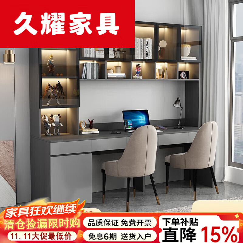 久耀2025新款双人电脑桌书桌书架一体桌轻奢办公桌写字桌学生学习桌子 深灰+玻璃 长205宽60高220cm
