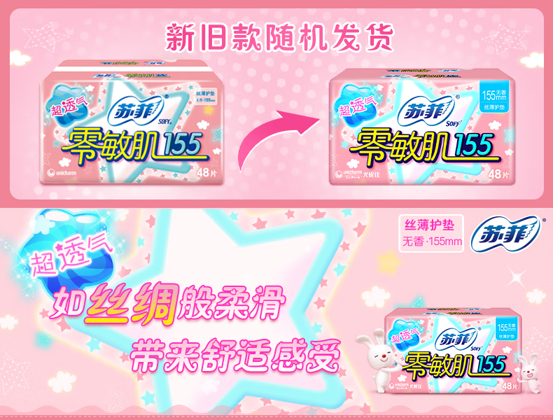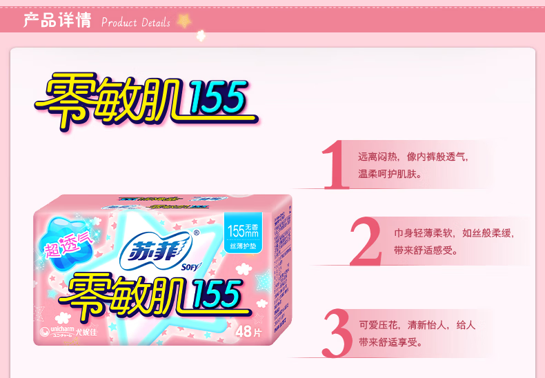 苏菲卫生巾零敏肌生理卫生护垫姨妈巾无翼型 无香 155mm 48片