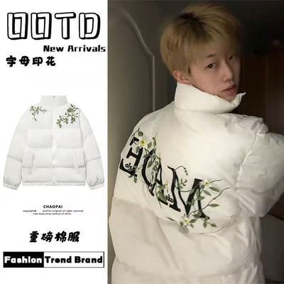 国潮美式花卉印花加厚冬季立领棉服男女宽松百搭面包棉衣情侣外套